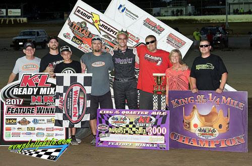 After the awards presentations, the K&L Ready Mix NRA Sprint Invaders would be the first up in their 10 lap King of the Quarter Mile race. No 6S Nate Dussel and No 22H Randy Hannagan would bring the field to green with No 17 Jared Horstman and Hannagan making contact with Horstman spinning and keeping the 17 rolling, but losing lots of ground to the leaders. Nate Dussel would lead wire to wire, claiming the $3000 winners prize and the King of the Quarter Mile Crown for 2017.