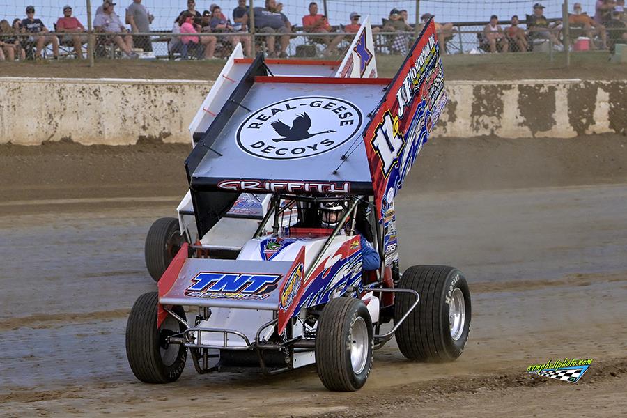 Completing the nights racing were the NRA Sprint Invaders under the banner of the Great Lakes Super Sprints. No. 11G Luke Griffith and No. 7C Phil Gressman would make up the front row for the 25 lap feature, with Griffith grabbing the early lead. In a green to checkered feature event, the action was hot and heavy throughout the race with the leaders hitting lapped traffic on lap 10. Gressman would pull off a big slide job in turns 3 and 4 to grab the lead for a moment, as Griffith would cross over to regain the lead. No. 17 Jared Horstman would use the same maneuver on Gressman, but both drivers got snookered by No. 22H Randy Hannagan who was able to slip by on the inside and set his sights on race leader Griffith on lap 11. No. 24 Kobe Allison enjoyed a tremendous run, battling with Hannagan in the closing laps for the second position. In the end Griffith would pick up his second win of the season over Hannagan, Allison, Horstman, and Gressman.