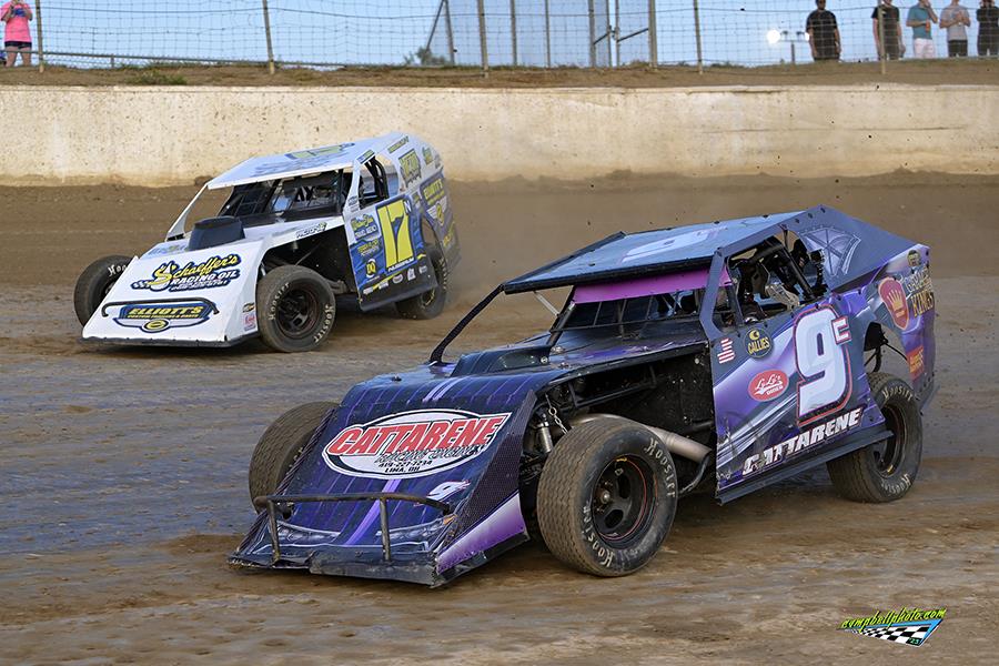 Next up were the Midwest Shooting Center DIRTcar UMP Modifieds in their 20 lap feature, with No. 463 Daniel Sanchez and No. 17N Dillon Nusbaum bringing the field to the initial green flag. Sanchez would lead into turns 1 and 2, but Nusbaum was quick to charge to the lead. No. 114 Clayton Bryant from Yoder, IN made his way to the 2nd position on lap 3 and would battle with Nusbaum briefly, before Nusbaum pulled away. No. 57 Jeffrey Jessup would bring out the only caution flag, spinning his car while moving high out of the groove as the leaders approached. Nusbaum would pull away with the lead on the restart and pick up the win over Bryant, No. 22T Tony Anderson beat No. 9C Troy Cattarene by a nose for third, as Cattarene would finish fourth, with No. 25 Josh Lolmaugh just nipping defending track champion Todd Sherman at the line for fifth.